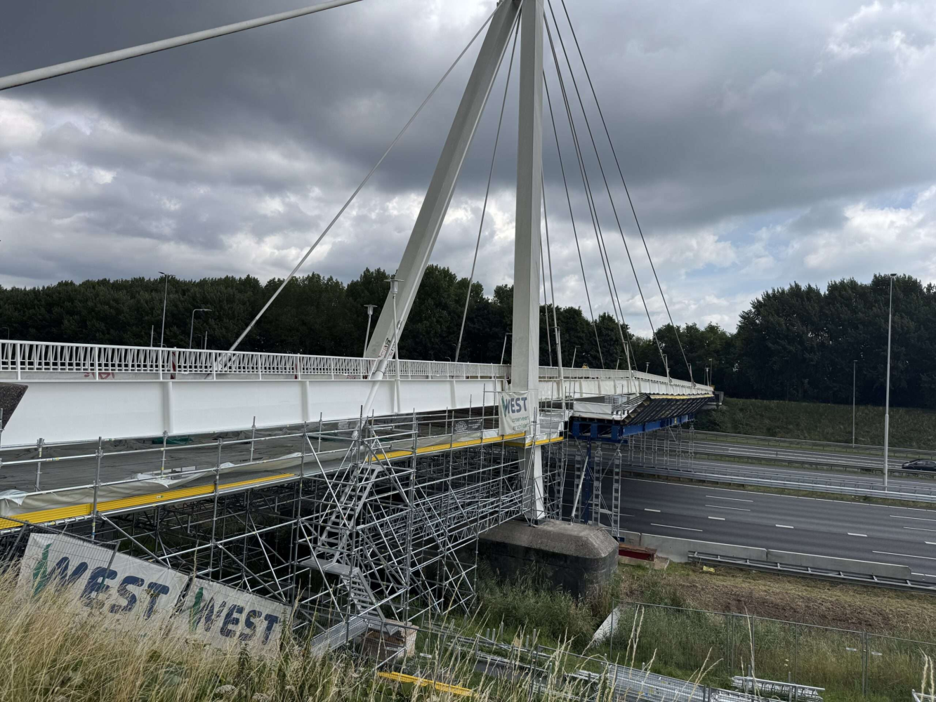 Onder de brug raast dag en nacht verkeer over de A16. WEST werkt daarom met steigers, vangconstructies en waar nodig in de nacht. Alles gebeurt in overleg met Rijkswaterstaat en de gemeente.
